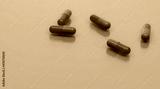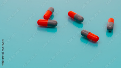 Gray-orange antibiotic capsules pill spread on blue background. Pharmacy banner. Prescription drug. Antibiotic drug resistance. Pharmaceutical industry. Healthcare and medicine. Antimicrobial drugs.