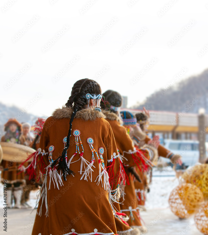 Folk ensemble performance in dress of indigenous people of Kamchatka. Selective focus