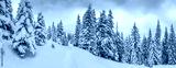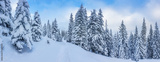 Panoramic landscape of a snowy forest in the mountains on a sunny winter day. Ukrainian Carpathians, near Mount Petros.