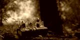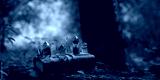 witch book and quartz minerals on dark natural forest background. Healing crystals of fluorite, amethyst. Magic Crystal Ritual, Witchcraft, spiritual esoteric practice. Reiki therapy for life balance