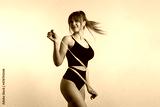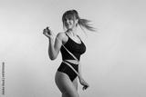 Slim healthy girl in black underwear with measuring tape at waist. Fit Woman poses in high waist panties and top. Perfect female body. Fitness, Diet or body care concept. Female shows her flat belly