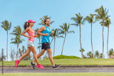 Sport fitness runners couple running lifestyle. Healthy people jogging together in summer city park outdoor, athletes training cardio on sidewalk.