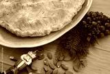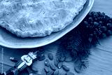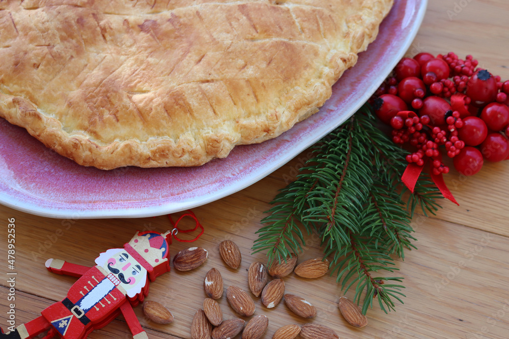 Galette des rois, traditional french cake with almod cream on aplte on wooden table with Christmas decorations