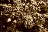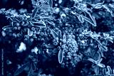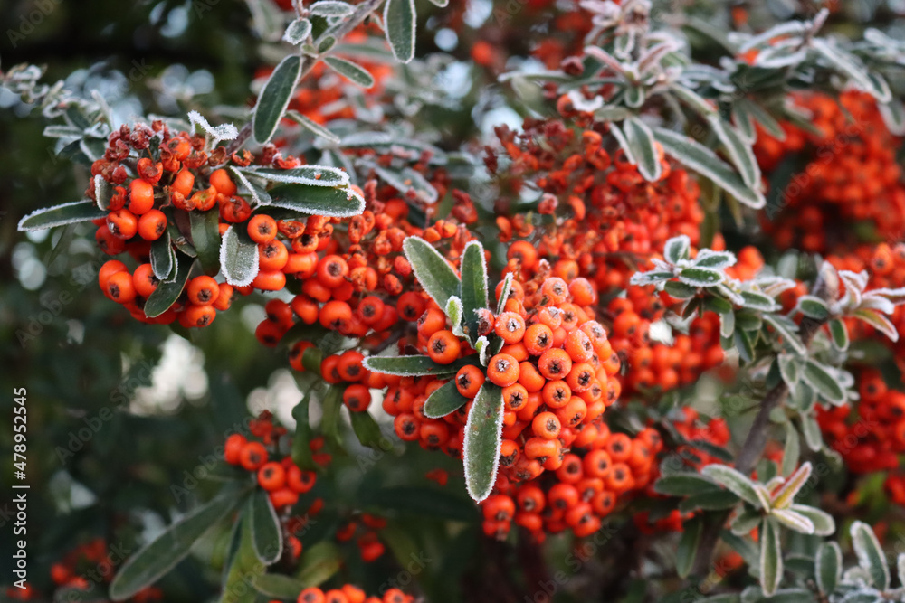 Pyracantha or Firethorn hedge covered with frost on winter season. Firethorn with red berries and frost in the garden