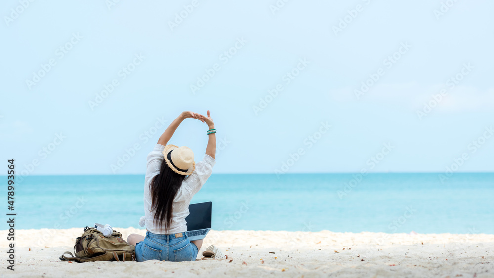 Lifestyle freelance woman raise arms relax after using laptop working on the beach. Asian people success and together your work pastime and meeting conference on internet in holiday