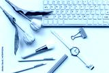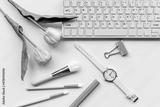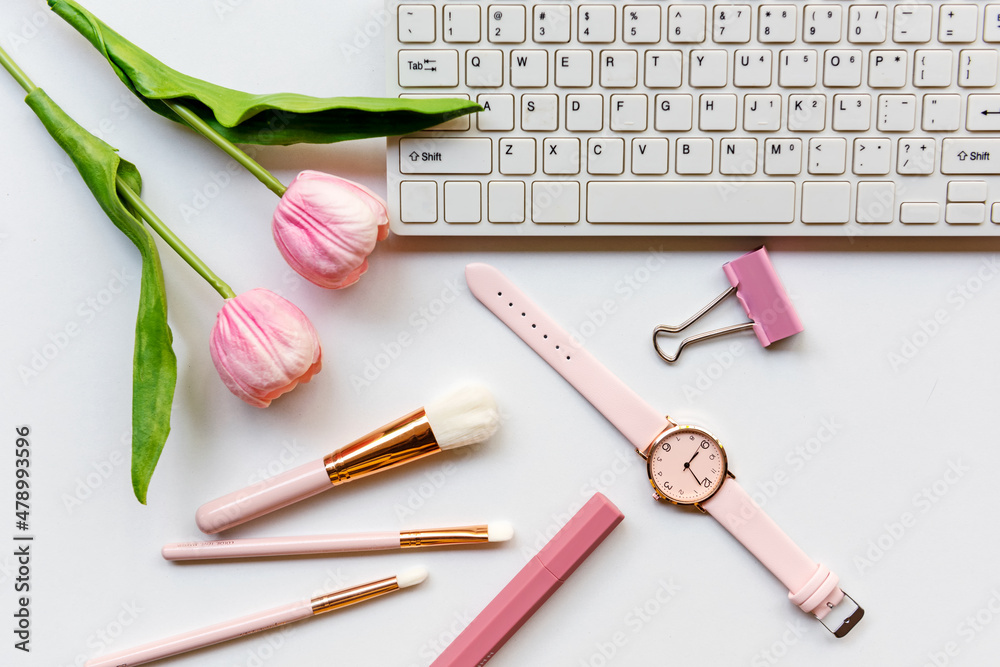 Makeup beauty cosmetic fashion in office. Cosmetics woman working on laptop with bag product facial and coffee on white background. Lifestyle fashion Gift Concept, top view