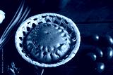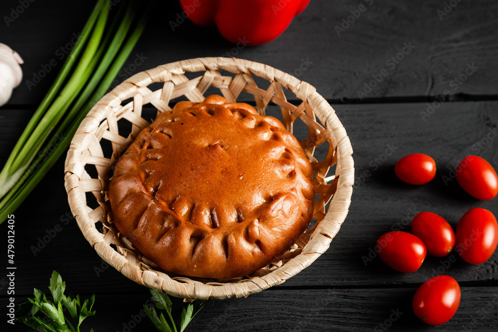 Round pie in a wicker basket on a black wooden background. Composition with ingredients.