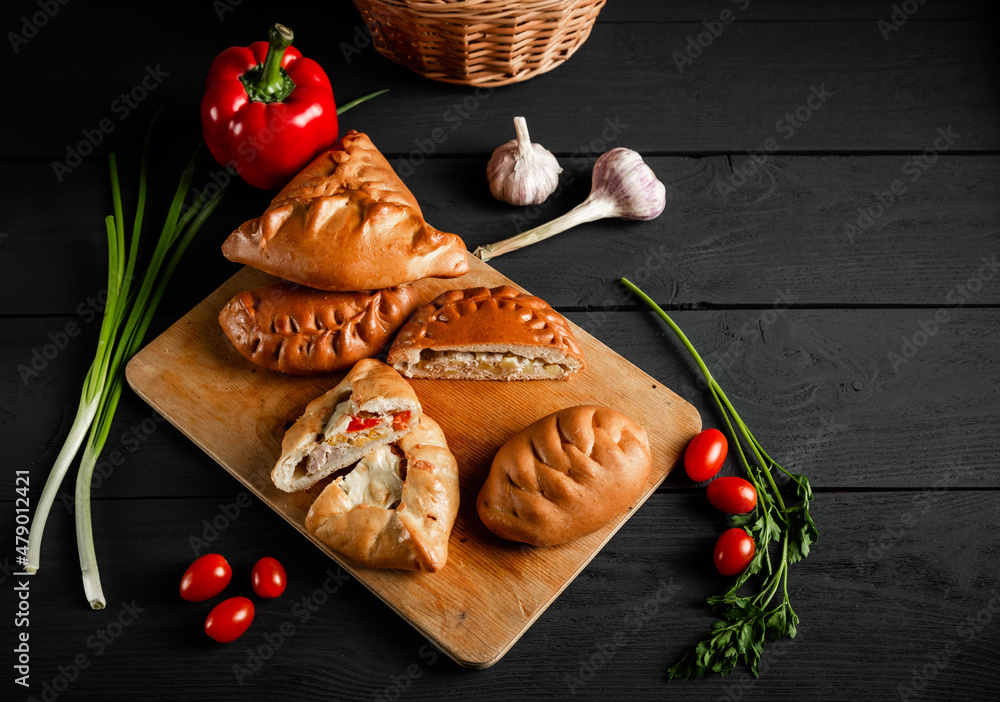 Homemade pies on a cutting board. Composition on a black background with ingredients. With a copy space.
