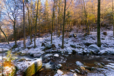 sunny forest with a river in winter (Harz, Germany)