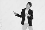 Portrait of happy smiling young boy in elegant clothes pointing on a copy space on a light grey studio background.