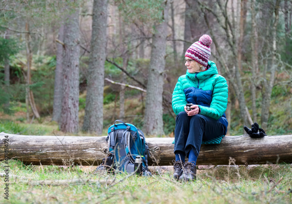 Single elderly woman resting during walking in forest during lockdown for good mental and physical health