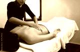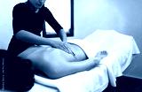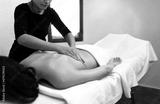 Female massage therapist giving therapeutic massage to young woman. Copy space.