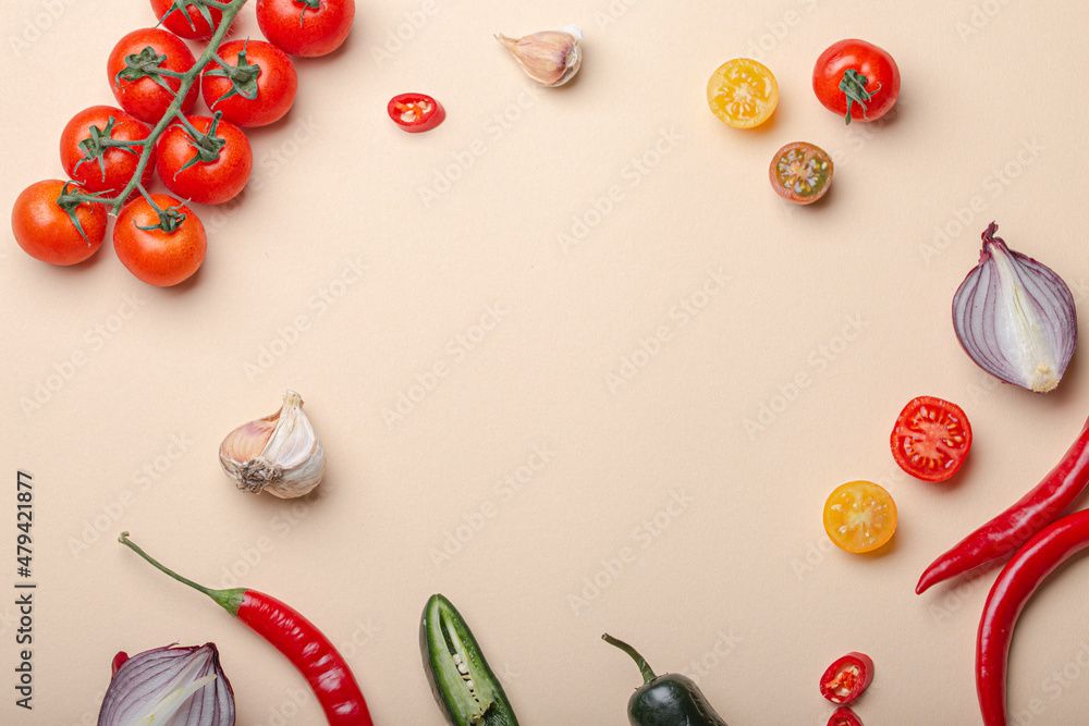Creative cooking healthy organic food concept background made of colourful fruit and vegetables on beige background flat lay: tomatoes, broccoli, avocado, onion, garlic top view with space for text