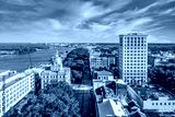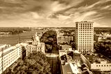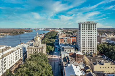 Aerial view of Savannah Georgia historic center with city hall the savannah river Johnson square business center high rise mid century office building