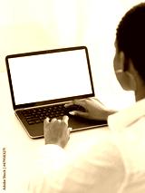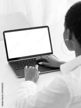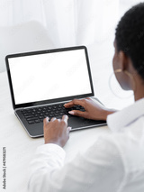 Laptop working. Remote job. Freelance lifestyle. Wireless device. Unrecognizable business woman typing at blank mockup screen notebook at office desk workplace.