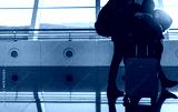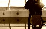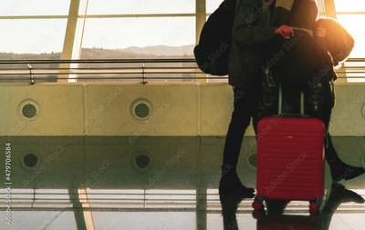 Blurred tourist with baggage walking in international airport. Airline passenger with luggage in the morning with sunrise. Vacation travel abroad and flight transfer concept. Happy couple journey.
