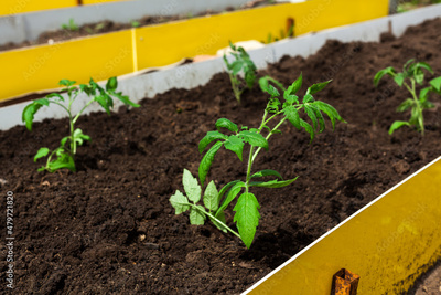 Tomato saplings grow in the ground. spring tomato seedlings for the garden growing in the open field. farm with organic food and vegetables, planting and gardening concept, background