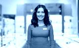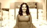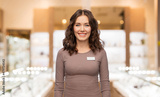 sale, shopping and business concept - happy female shop assistant with name tag over jewelry store background