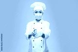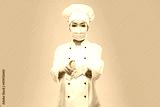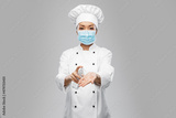cooking, safety and health concept - female chef in protective medical mask and toque applying hand sanitizer or liquid soap over grey background