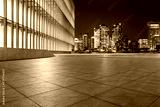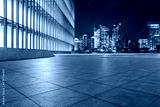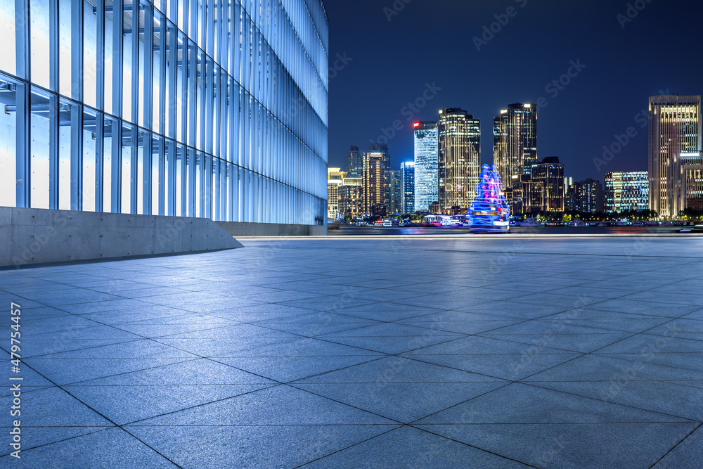 Empty square floor and modern city buildings in Shanghai at night, China.