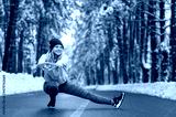 Female runner jogging in the forest on a winter day. Crouching and stretching after running