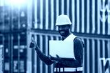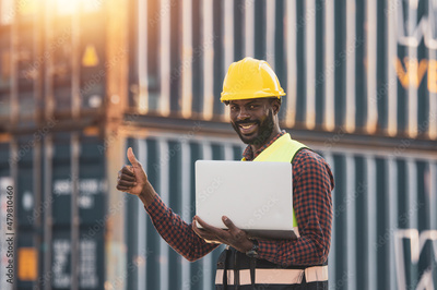 American men of color Work in an international shipping yard area Export and import delivery service with containers, African American worker