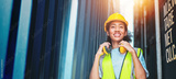 American women of color Work in an international shipping yard area Export and import delivery service with containers