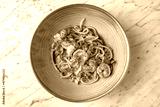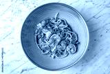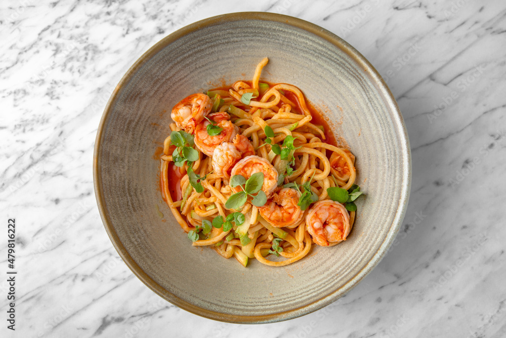Spaghetti with shrimps in tomato sauce with green onions in a festive plate on a marble background. Restaurant banquet menu.