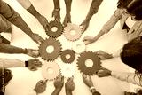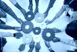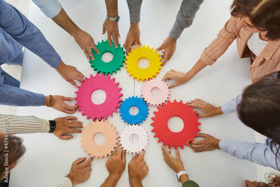 Team of young and senior business people holding and joining colorful gear wheels on office desk as symbol or metaphor for teamwork efficiency and effective collaboration. Top overhead view from above