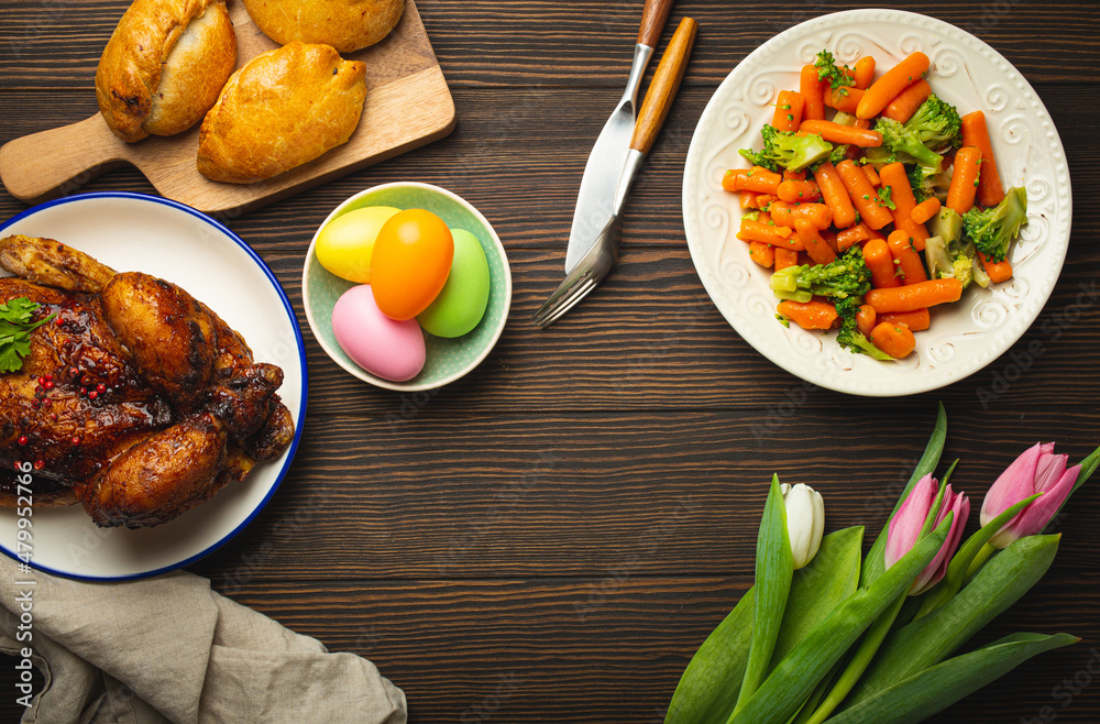 Easter food on dark rustic table: pastel colored eggs, roasted chicken and vegetables, buns and spring flowers tulips top view flay lay, Easter family dinner meal with festive dishes, space for text