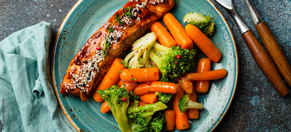 Grilled salmon fillet steak in teriyaki sauce with roasted vegetables carrot and broccoli on plate with fork and knife top view on rustic concrete background table, healthy diet and eating concept