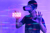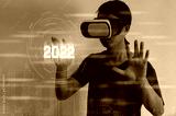 man wearing VR glasses touch 2022 virtual screen. Business metaverse concept technology.