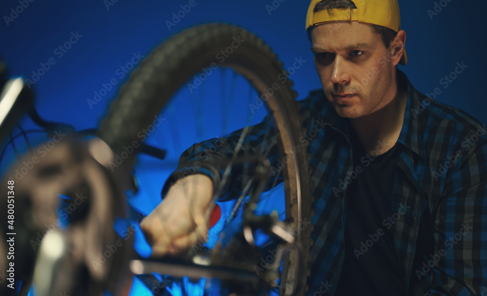 Technician calibrates the wheel of the bicycle. Bicycle repair workshop.