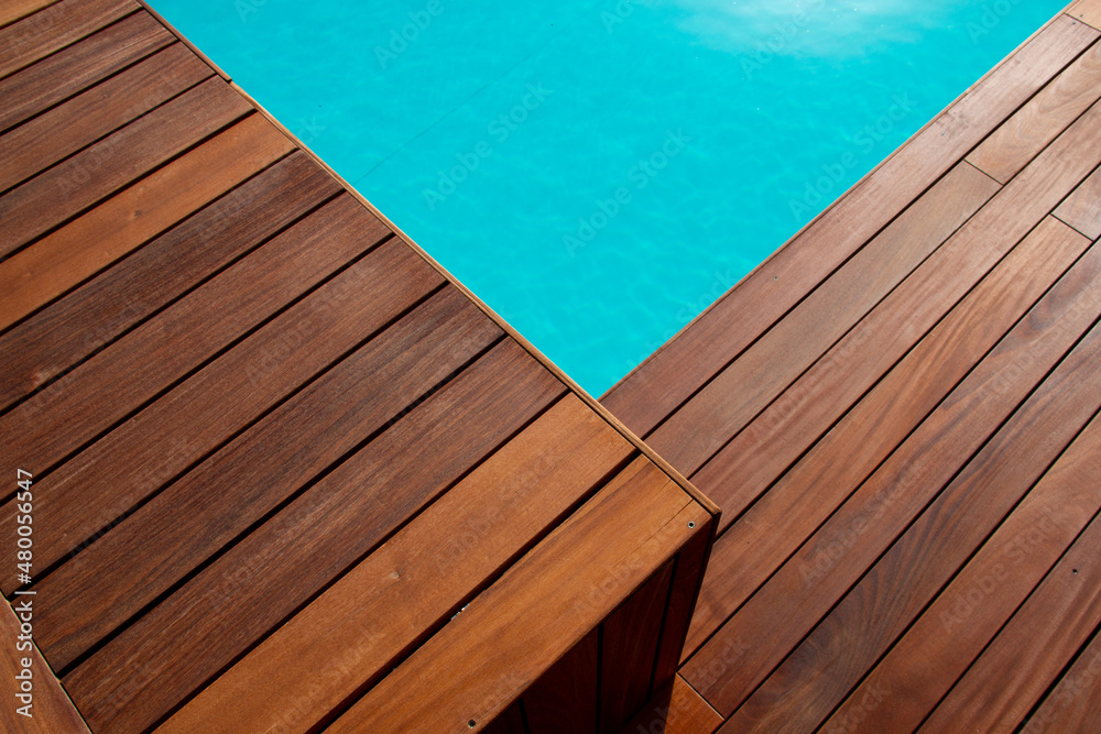 Diagonal line of exotic hardwood in detail decking around the blue water swimming pool corner
