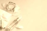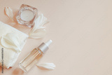 Spa and aromatherapy concept. Candles, towel and flower petals on trendy beige background.
