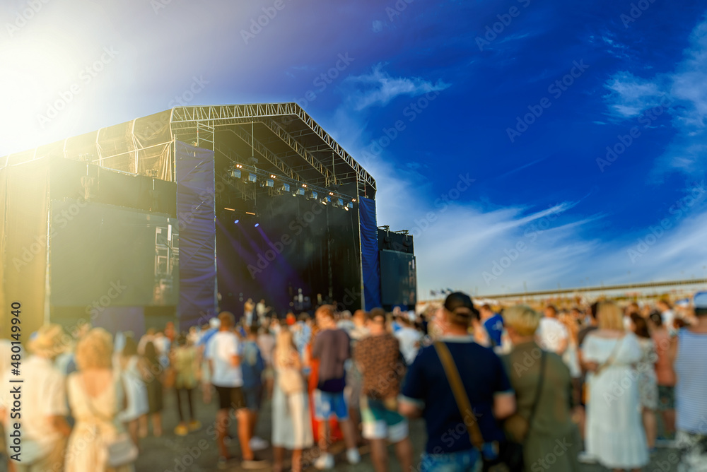 Musical band performing live on the stage. Blurred image.