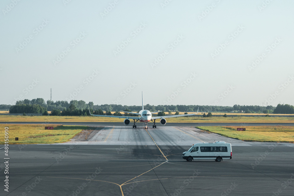 Transfer from the airport. White minibus is waiting for guests in front of the plane. High service, reception of guests.