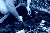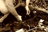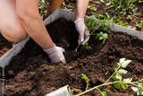 Woman's hands plant a young tomato seedling in ground open field. farm with organic food and vegetables, planting and gardening concept, background, sustainable lifestyle