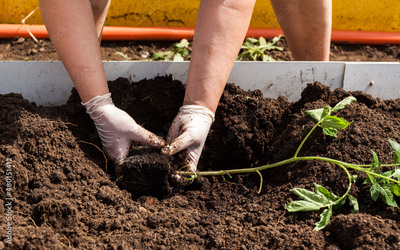 Woman's hands plant a young tomato seedling in ground open field. farm with organic food and vegetables, planting and gardening concept, background, sustainable lifestyle