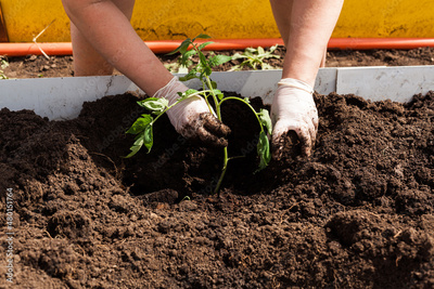 Woman's hands plant a young tomato seedling in ground open field. farm with organic food and vegetables, planting and gardening concept, background, sustainable lifestyle