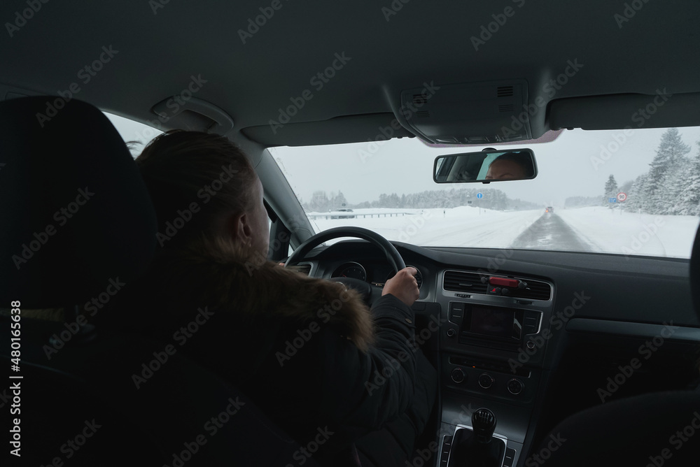 Woman driving a car in winter time.