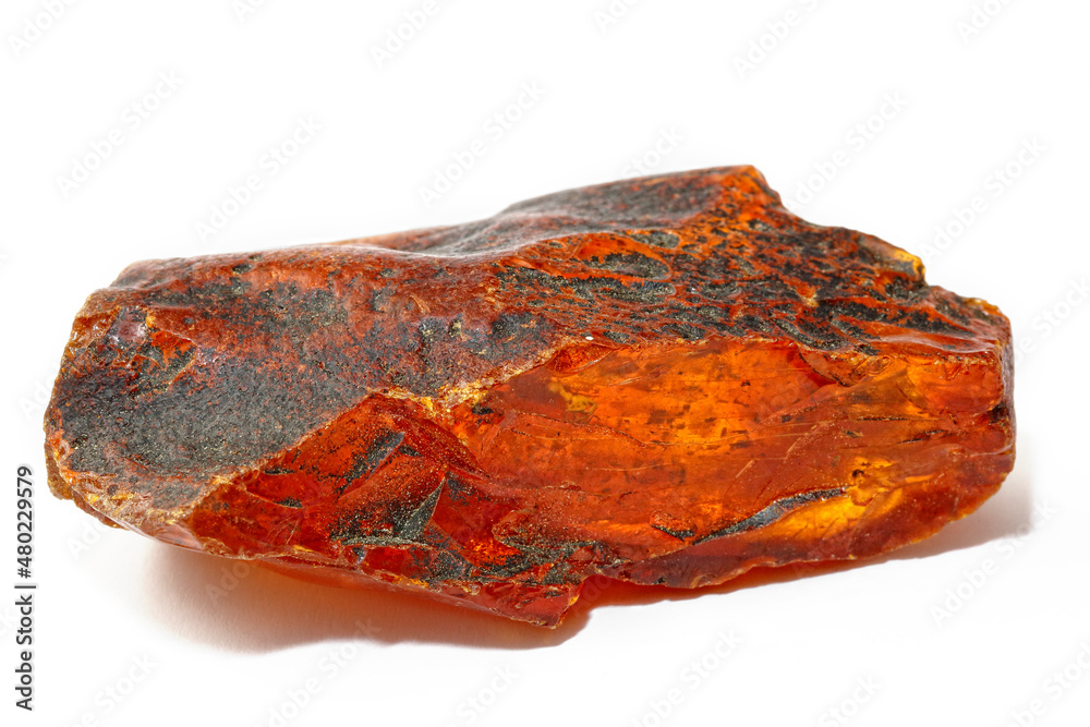 Red amber on a white background. Solar stone with inclusions. Natural fossilized resin. Copal. semi-precious mineral. Material for jewelry and ornaments. Crystal. Resin