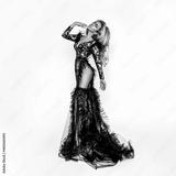 Elegant fashion. Stunning blonde woman in elegant long black dress and perfect hairstyle on white background. Luxury evening fashion. Glamour fashion model. Elegance. black and white photo.