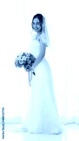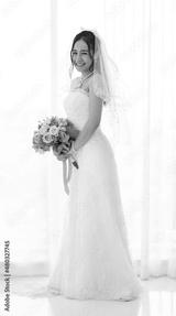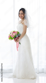 Studio shot of Asian young happy beautiful luxury long hair female bride in white wedding dress standing smiling posing holding pink roses flower bouquet in front of curtain in engagement ceremony