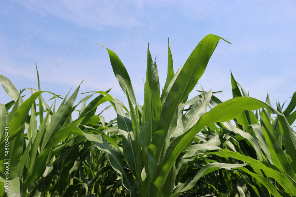 Green corn field on summer season against blue sky on a sunny day. Zea mays or corn cultivation