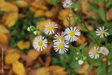 Erigeron annuus. Close-up of wild white and yellow daisies on early autumn also called fleabane daisy