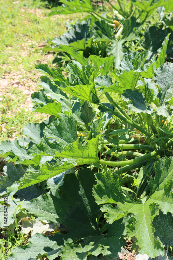 Courgette or Zucchini Plant (Cucurbita pepo) in a vegetable garden on summer