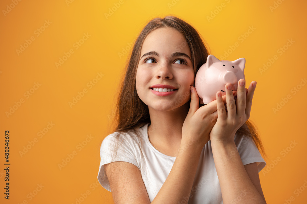Teen girl with piggy bank on yellow background.
