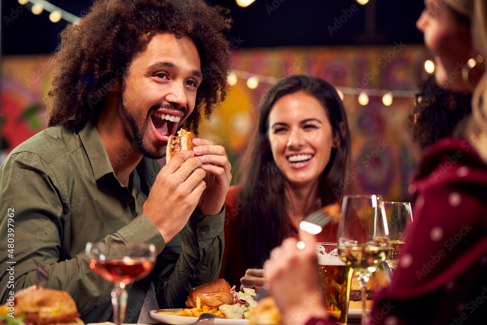 Multi-Cultural Group Of Friends Enjoying Night Out Eating Meal And Drinking In Restaurant Together