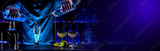 Bartender's hands serving cocktails on bar counter in a restaurant, pub. Mixed drinks. Alcoholic cooler beverage at nightclub on dark background